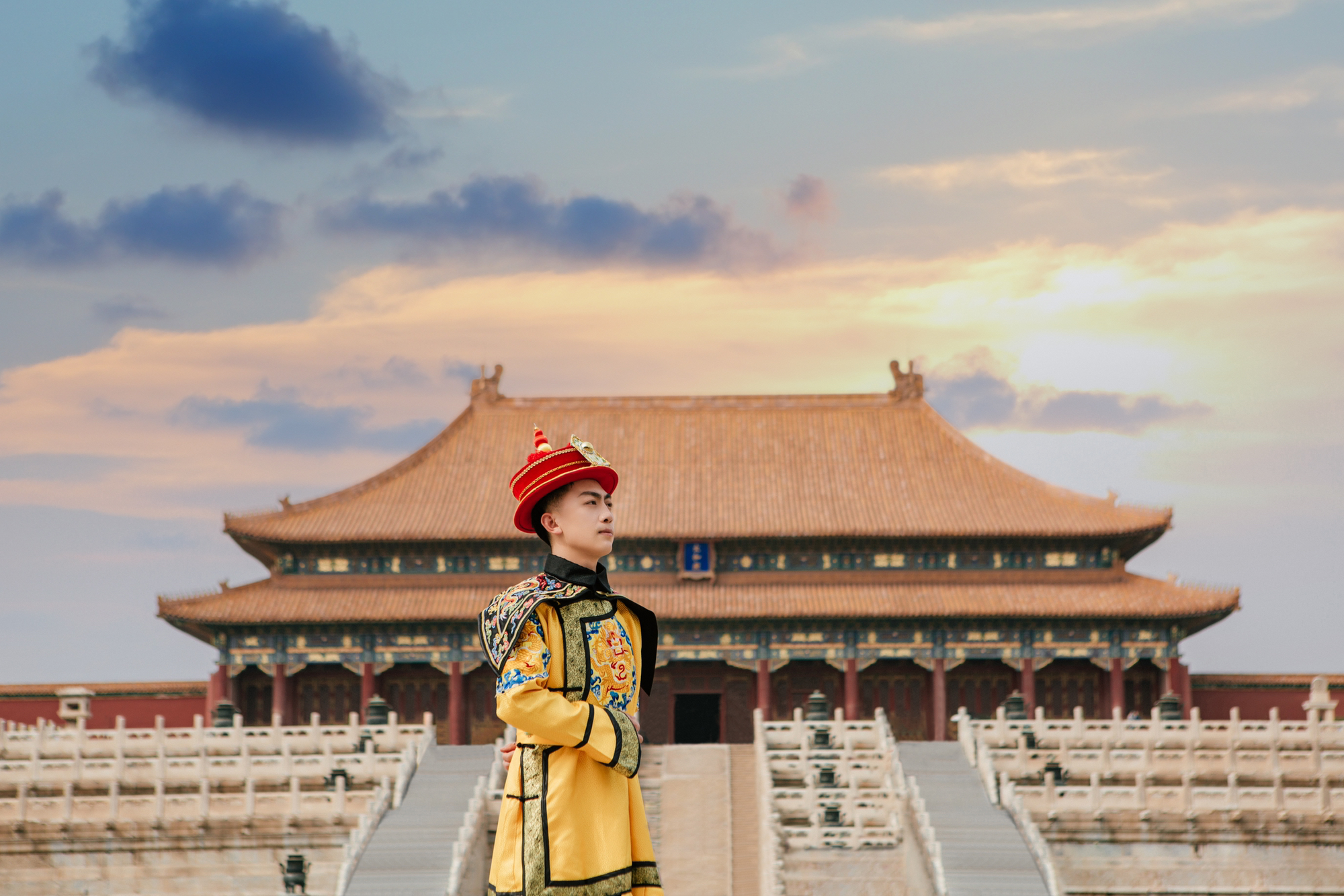 服务详情价格:398元/日(全套衣服+清宫妆造+皇帝帽子+男靴鞋+道具)